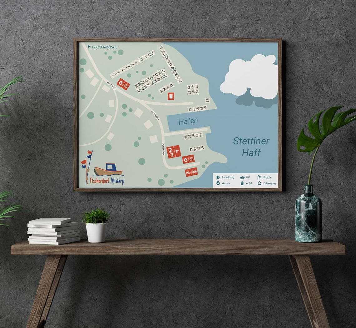 Entwicklung eines Corporate Design für die Gemeinde Altwarp in Mecklenburg-Vorpommern. Erstellung einer Website mit Fokus auf Tourismus und Leben im Ort. Auf Basis der gewählten Farben sind unter anderem das neue Logo, Visitenkarten, Briefbögen, Fahnen, Flyer, Plakate, Aushänge und eine Karte für den Hafenbereich entstanden.
